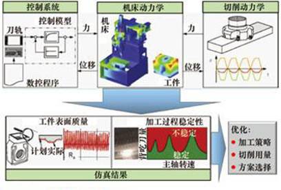 德國斯圖加特大學機床控制研究所在主持歐盟的OSACA開放式數控系統研究項目的基礎上,提出機床硬件在環(Hardware in the Loop)和多剛體耦合的機電一體化仿真技術,將實際數控系統和機床的數字模型集成在一起進行仿真。借助Matlab建立機床的控制模型,數控系統的控制指令發送到控制模型中,通過仿真將運動信息和驅動力或力矩傳遞到機床多體模型中,并將執行部件的位移反饋回數控系統。機床的所有運動及其特性通過三維模型動畫和曲線顯示。這樣通過仿真分析就可得到機床的動態特性,由此可進行數控系統與機床的匹配驗證以及控制參數的優化。進一步還可以將切削加工的物理過程仿真也加入進來,對機床加工過程進行全面的仿真,預測工件的表面質量和加工過程的穩定性,如圖5所示。