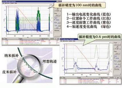 納米插補不僅僅是一個軌跡計算精度的問題,它涉及到前瞻平滑處理、插補位控周期和伺服系統動態響應及精度的問題。例如,不同插補精度對輸出電流和加速度的影響如圖3所示。應該指出,角度編碼器至少要達到每轉百萬線以上,插補位控周期至少要100 μs級才能實現納米級控制的所期望的效果。