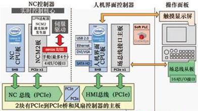 人機界面CPU以PC平臺構建,以體現其開放性。控制核心或PLC可采用不同的CPU系統,但集成在一個機殼中,通過數字化總線和伺服系統及I/O通信。這種結構僅實現人機界面的開放,硬件系統仍取決于數控系統供應商。典型產品如西門子828D、Fanuc 30i和德龍的Antronic3060(圖2)。