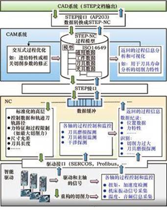 從圖中可見,CAD系統輸出STEP文檔,借助AP203接口將數據轉化為STEP-NC后作為CAM系統的輸入,借助零件加工特征及工藝模型生成STEP-NC加工程序,它只向機床下達“加工什么”,而由數控機床決定“如何加工”。數控系統接收STEP-NC程序,生成高層控制數據和加工軌跡,最后通過總線接口傳送至開放的智能驅動模塊,驅動進給和主軸。機床運動部件的工況反饋給數控,數控根據這些工況信息來調整加工參數和策略。并可將信息反饋給CAM系統,從而對STEP-NC編程產生影響,所以CAM到CNC的信息和數據流是雙向的。