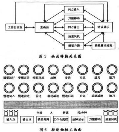 主畫面形象直觀地顯示龍門刨床工作臺的往復運動狀態、抬刀動作和與工作臺有關的限位開關的通斷狀態。用指示燈顯示工作臺的各種狀態,例如前進、后退、慢速切入、前進減速和后退減速,以及工作臺步進和步退.。還用指示燈顯示油泵風機、變頻器的狀態,以及進刀、退刀和故障信號等。畫面轉換關系和主畫面如圖5和圖6所示。