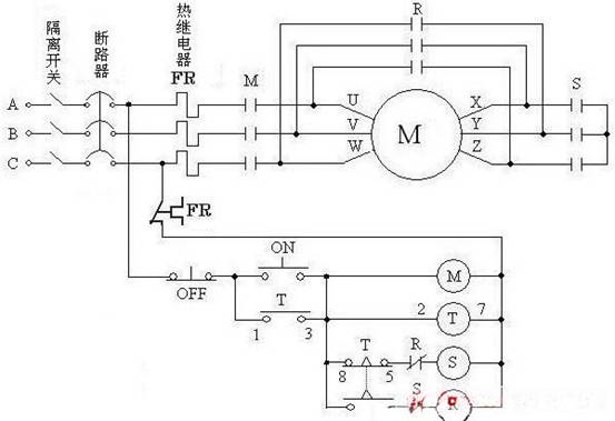 起動(dòng)過程:合上隔離開關(guān)---合上斷路器----按下ON啟動(dòng)按鈕---M,S,T得電---M接通主回路,S通過T的常閉觸點(diǎn)及R的常閉觸點(diǎn)得電---S主回路接通--正在做起動(dòng)運(yùn)轉(zhuǎn)過程。