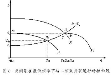 變頻泵與工頻泵并聯運行頻率f2 = fmin的性能曲線,如圖6 所示。