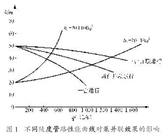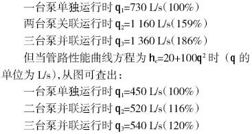 比較兩組數據可以看出:管路性能曲線越陡,并聯的臺數越多,流量增加的幅度就越小。因此,并聯運行方式適用于管路性能曲線不十分陡的場合,且并聯的臺數不宜過多。若實際并聯管路性能曲線很陡時,則應采取措施,如增大管徑、減少局部阻力等,使管路性能曲線變得平坦些,以獲得好的并聯效果。
