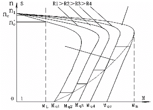 (2)圖中起動曲線與橫軸交叉點(diǎn)(Mq1、Mq2、Mq3、Mq4、Mqe)為起動初始電磁轉(zhuǎn)矩。ML為額定負(fù)載轉(zhuǎn)矩,對應(yīng)的轉(zhuǎn)速為電機(jī)額定轉(zhuǎn)速(Ne)。Mm為最大電磁轉(zhuǎn)矩。