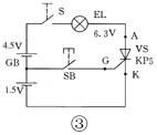 為了能夠直觀地認識晶閘管的工作特性,大家先看這塊示教板(圖3)。晶閘管VS與小燈泡EL串聯起來,通過開關S接在直流電源上。注意陽極A是接電源的正極,陰極K接電源的負極,控制極G通過按鈕開關SB接在3V直流電源的正極(這里使用的是KP5型晶閘管,若采用KP1型,應接在1.5V直流電源的正極)。晶閘管與電源的這種連接方式叫做正向連接,也就是說,給晶閘管陽極和控制極所加的都是正向電壓。現在我們合上電源開關S,小燈泡不亮,說明晶閘管沒有導通;再按一下按鈕開關SB,給控制極輸入一個觸發電壓,小燈泡亮了,說明晶閘管導通了。這個演示實驗給了我們什么啟發呢?